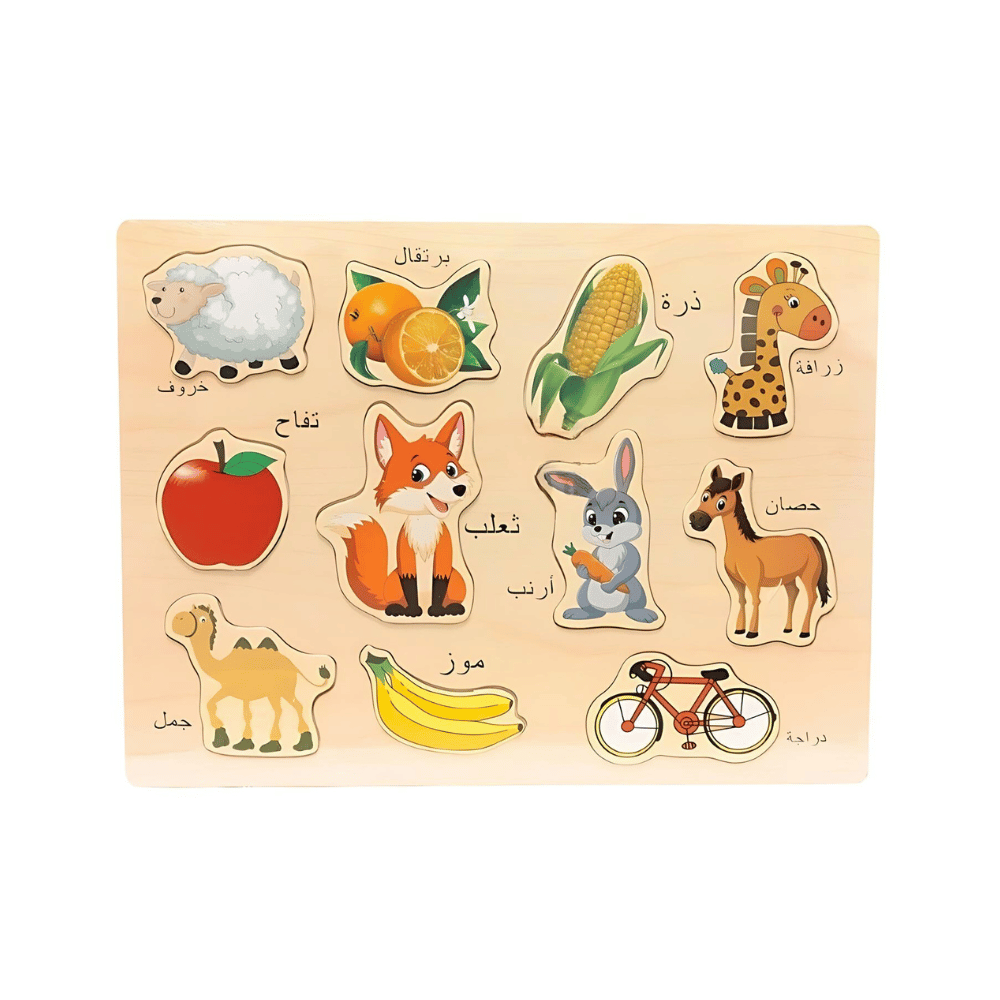 • أحجيات خشبية على شكل فواكة و حيوانات للأطفال من سن 1 إلى 3 سنوات مصممة من قبل المعلمين والآباء مع صور وكلمات ملونة تحت كل قصة