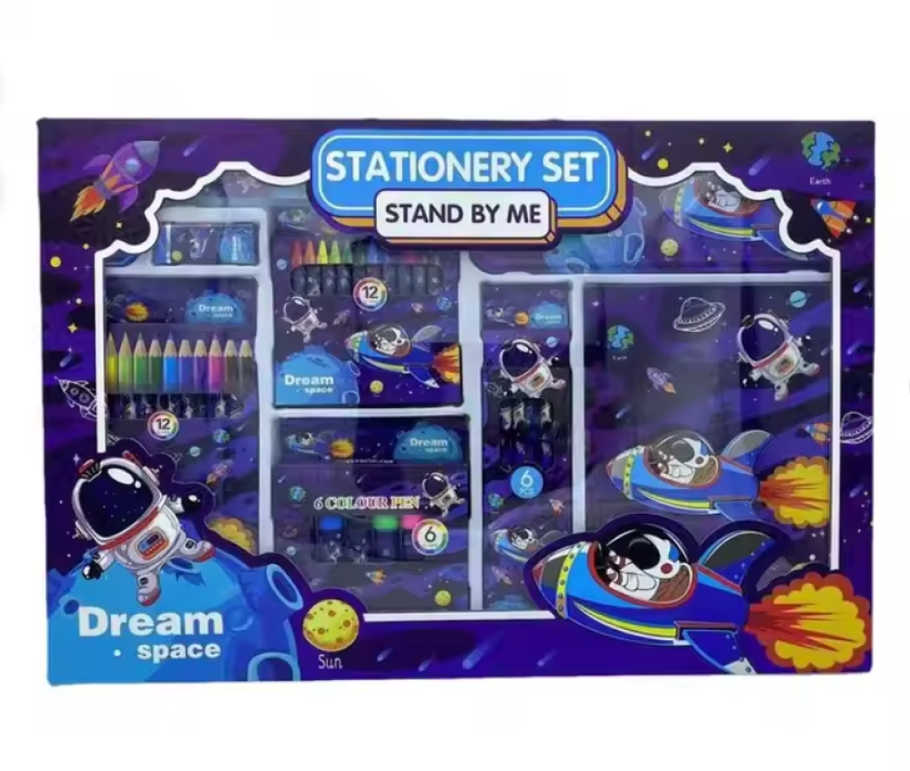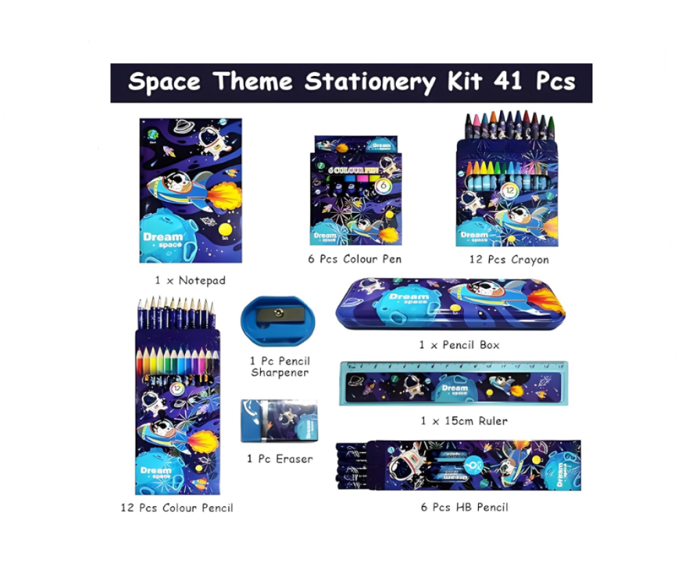 - 41 قطعة: دفتر، علبة أقلام، 12 شمع، 12 ألوان خشبية، 6 أقلام ألوان، 6 HB، ممحاة، مبراة، مسطرة 15سم.