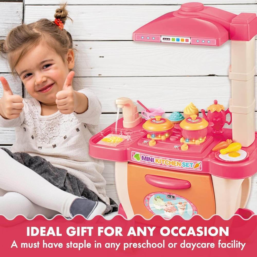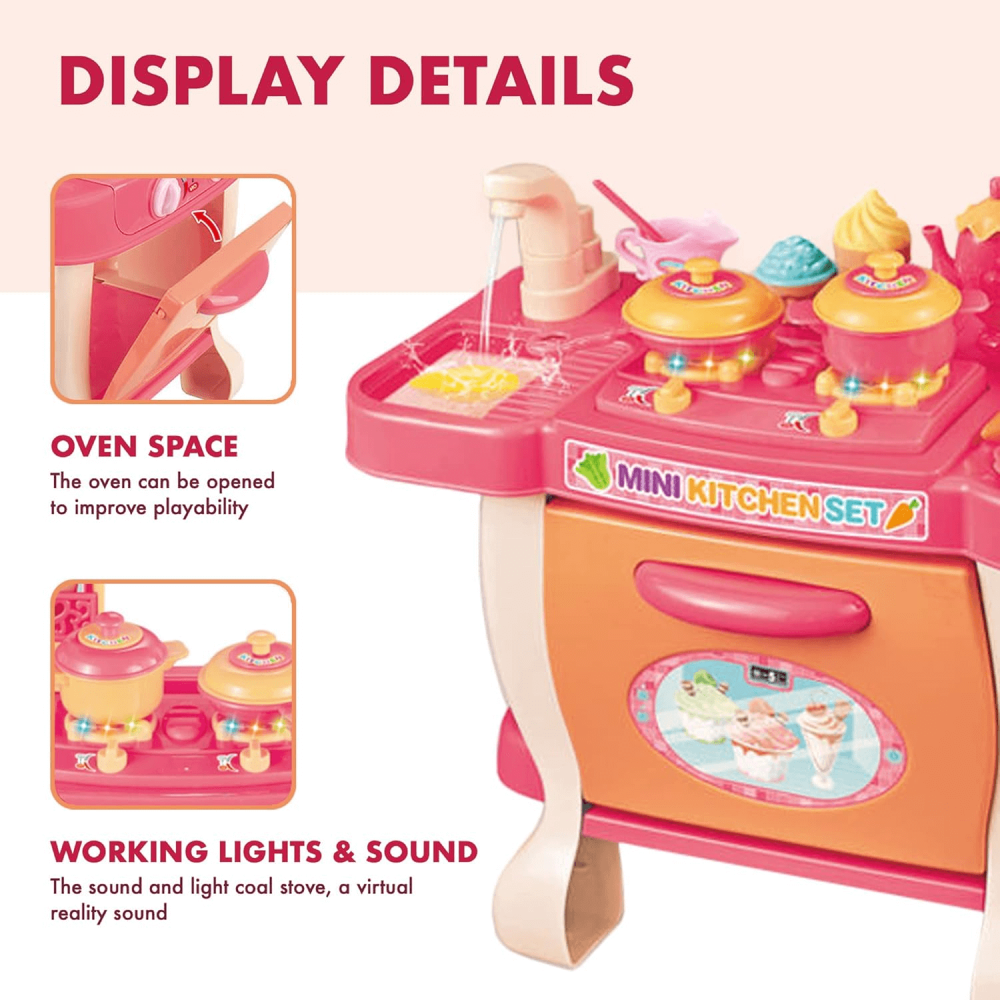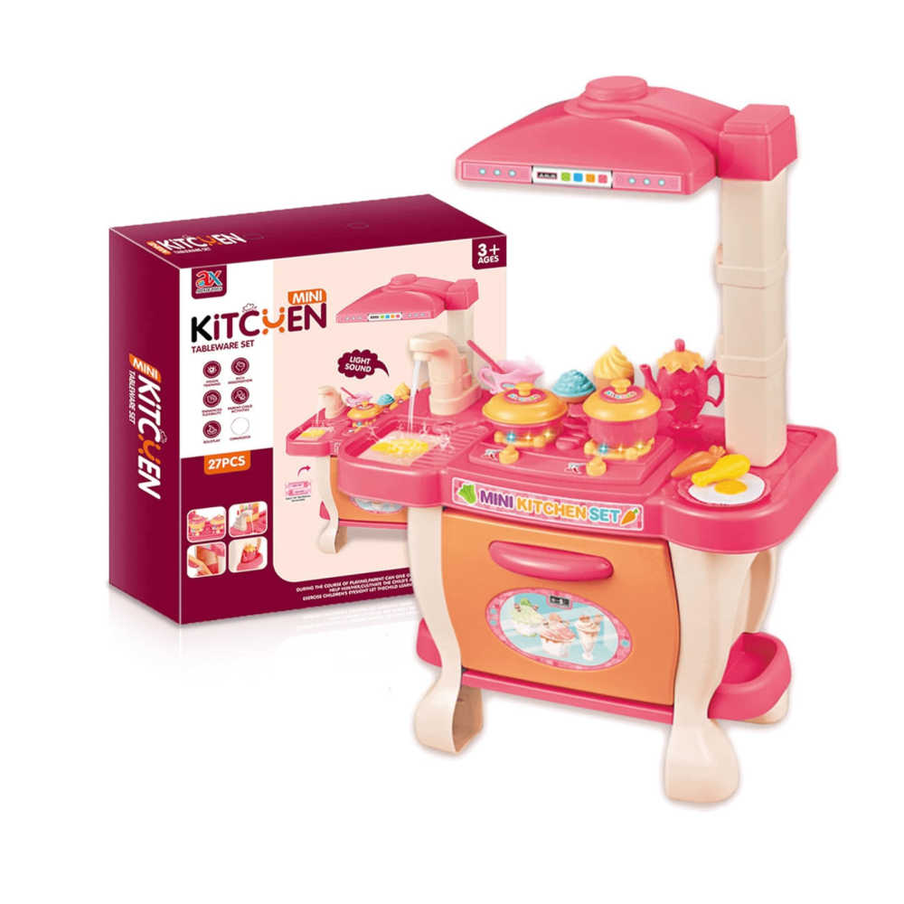 الوصف: مجموعة مطبخ لعب بـ27 قطعة، مع حوض ماء مضيء وفرن، تشجع الإبداع والتعلم، مثالية للأطفال.